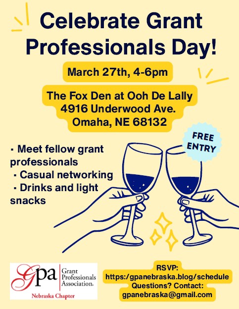 | MAR ’26 | Grants Professionals Month Celebration Friday, March 27, 2026 | 4:00 – 6:00 p.m. The Fox Den at Ooh De Lally Omaha | ![]() Register Here Flier HERE |